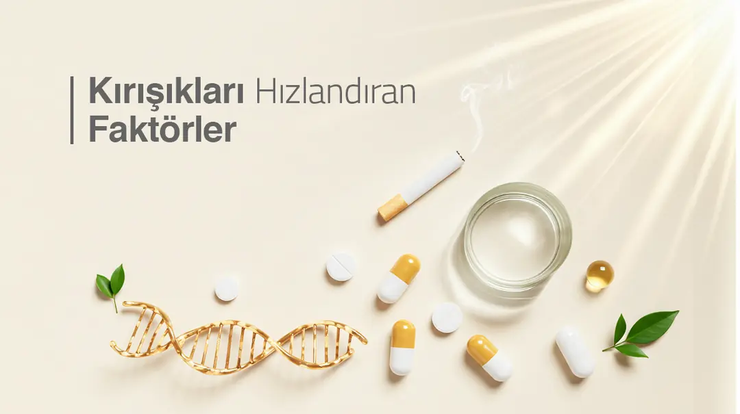 Aşağıdakiler de dahil olmak üzere birçok faktör kırışıklıkların gelişimini etkiler: