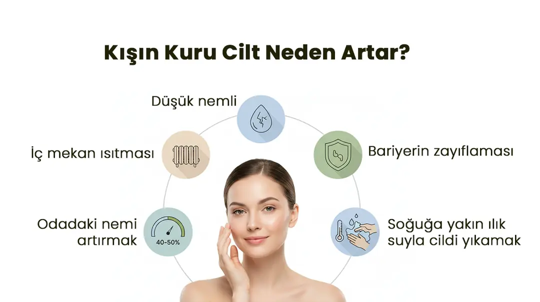 Düşük nemli ve sıcak iç ortam koşullarının cilt hidrasyonu ve bariyer göstergeleri üzerinde kısa sürede etkili olabildiğini inceleyen çalışmalar var; kışın “iç mekan ısıtması + kuru hava” ikilisi bu yüzden kritik. Odadaki nemi artırmak (ör. %40–50 bandı) ve soğuğa yakın ılık suyla cildi yıkamak kuruluğu azaltabilir.