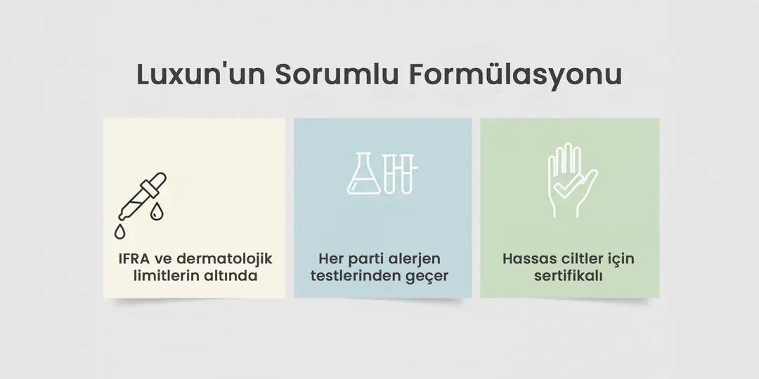 Luxun'un Sorumlu Formülasyonu: Ürünlerimizde uçucu yağ konsantrasyonları, IFRA (International Fragrance Association) ve dermatolojik güvenlik limitlerinin altındadır. Her parti, alerjen testlerinden geçer ve hassas ciltler için güvenlik sertifikaları alır.
