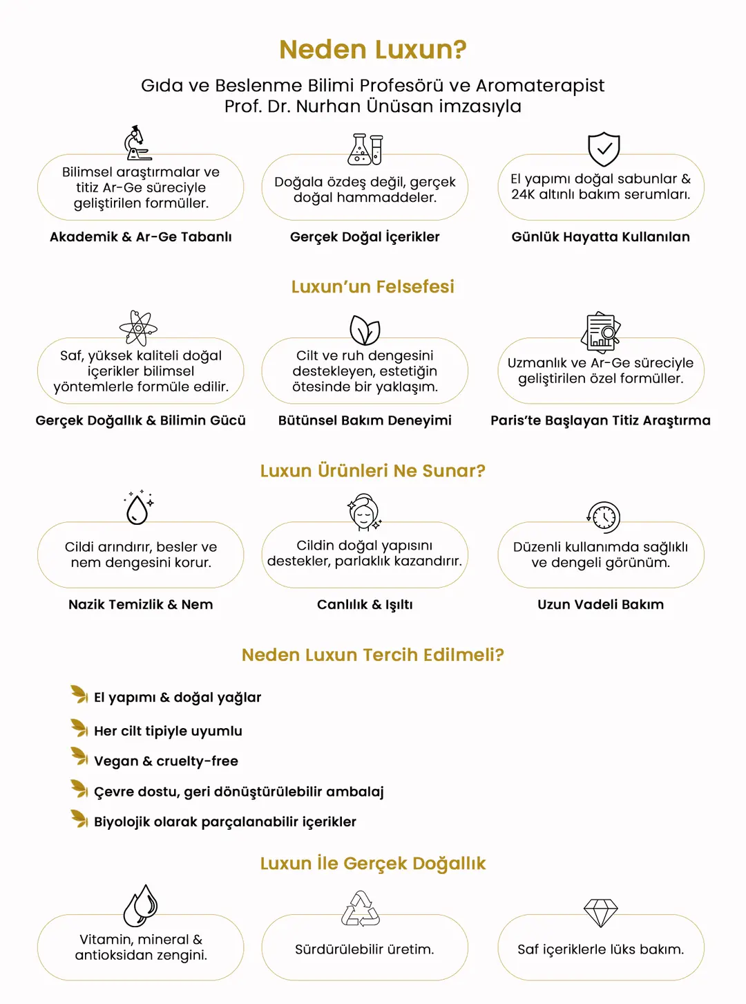 Ben Prof. Dr. Nurhan Ünüsan. Üç nesildir iş dünyasında yer alan bir ailenin girişimci bir ferdi, Gıda Mühendisi, Beslenme Bilimi Profesörü ve Aromaterapist olarak, yılların bilgi ve deneyimini Luxun markasında bir araya getirdim.
